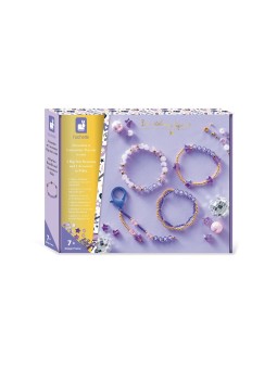 Le coffret contient tout le nécessaire : 120 perles rondes en métal, 60 perles bleues, 12 perles en métal, 4 perles à facettes, 4 perles transparentes, 12 perles mauves transparentes, ainsi que du fil élastique, du fil de jade coloré et un mousqueton en plastique pour le porte-clés. Cette activité créative développe la motricité fine et la créativité, tout en offrant des heures de plaisir et nécessite 50 minutes pour réaliser ces créations.