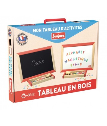 Tableau d'activités avec une ardoise en bois réversible : une face pour écrire à la craie et une face blanche magnétique. Très pratique pour être utilisé et emporté partout grâce à sa valisette de rangement, ce tableau se pose sur un support en bois comprenant un compartiment de rangement pour les accessoires.